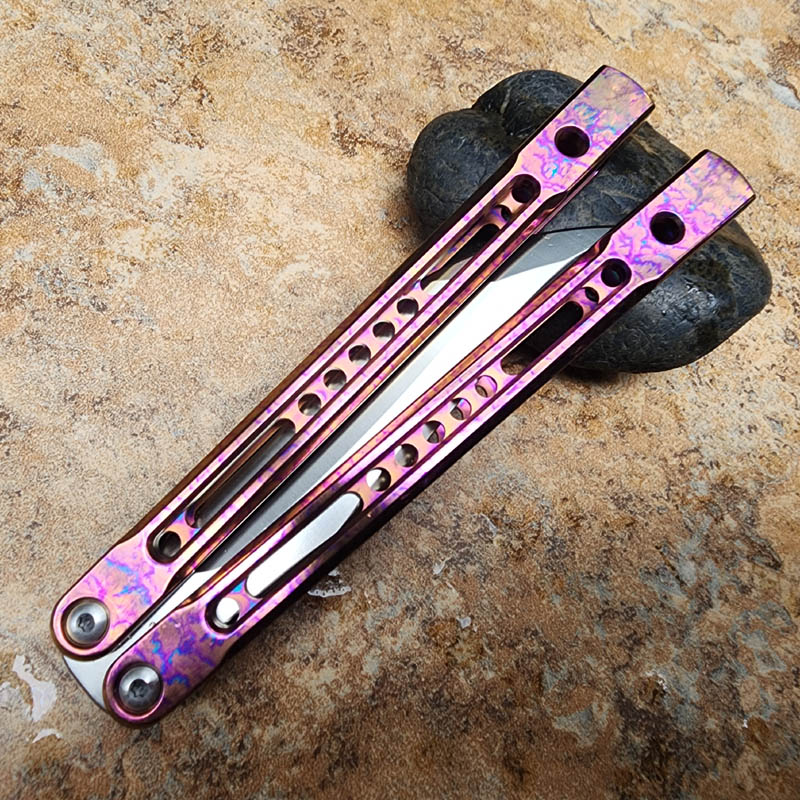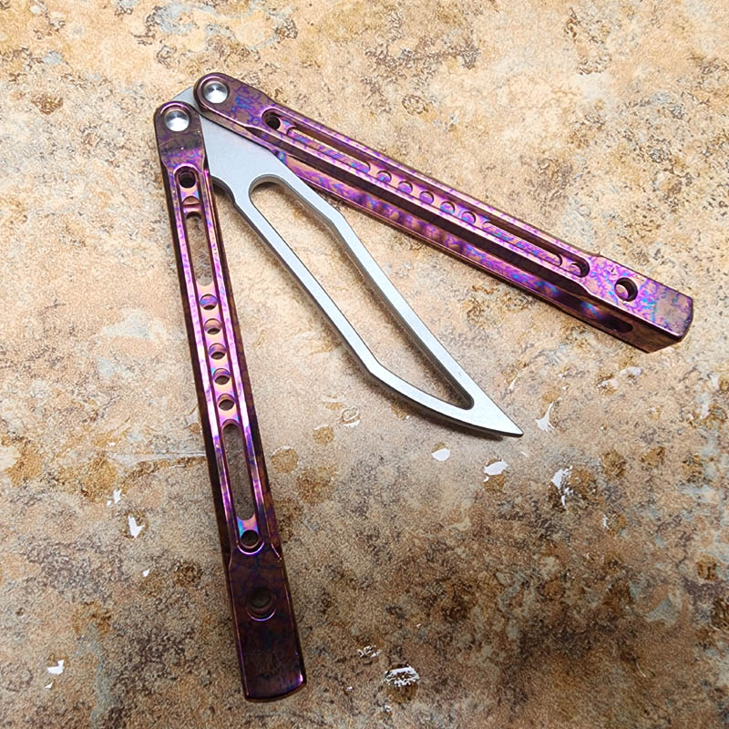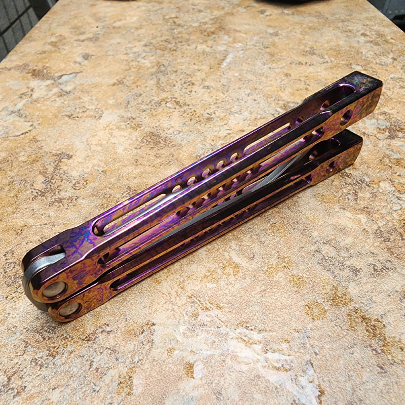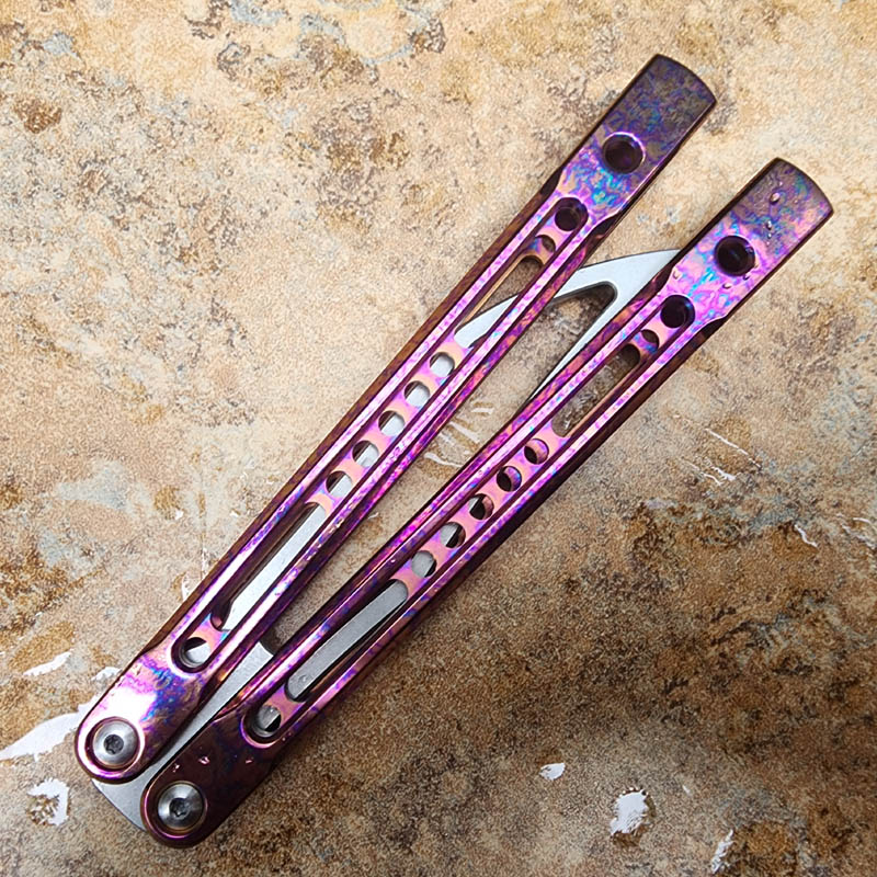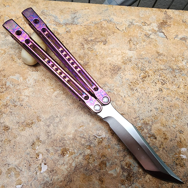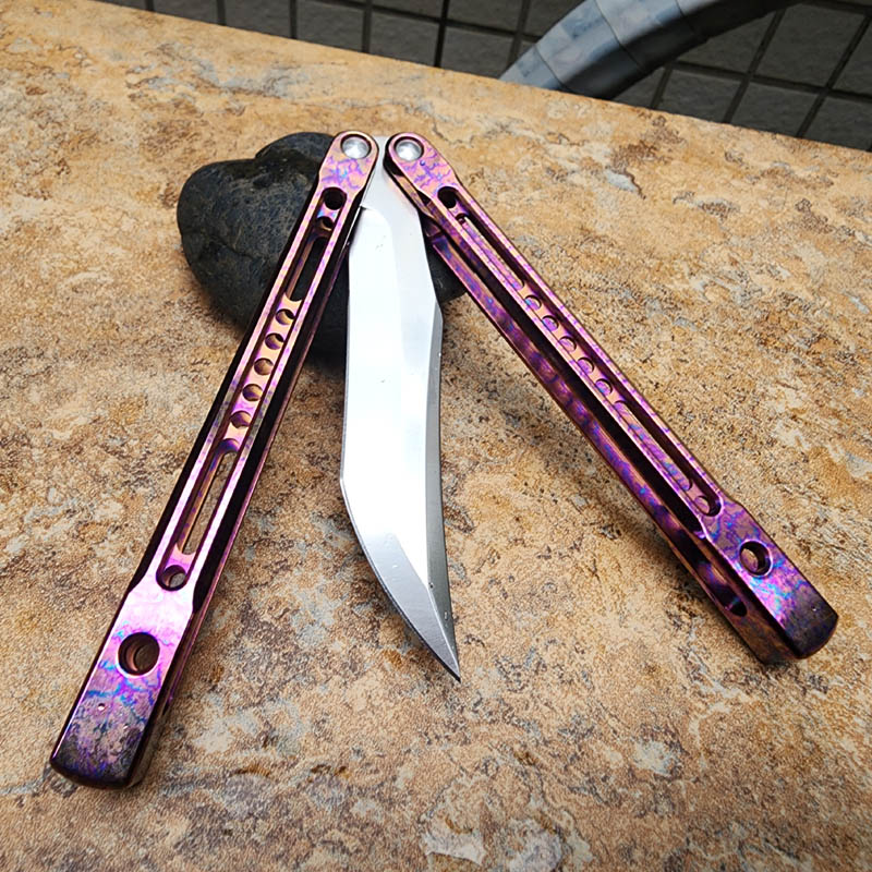 一体钛柄火烧纹JK King 君王蝴蝶甩刀系列,bushing轴套系统,搭配钛内衬,钛合金手柄,。转动非常顺畅,D2刃材,数控精磨