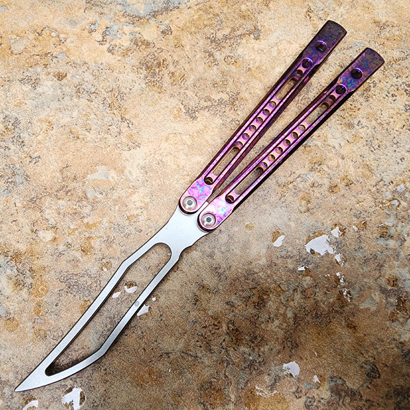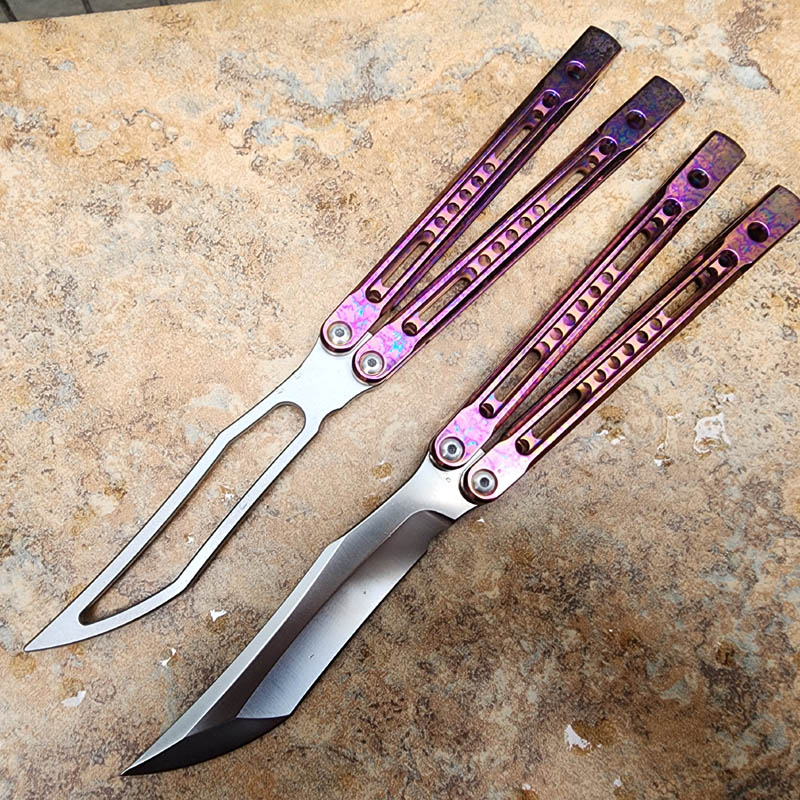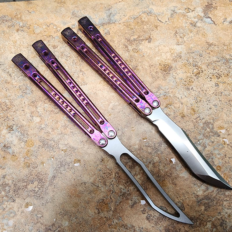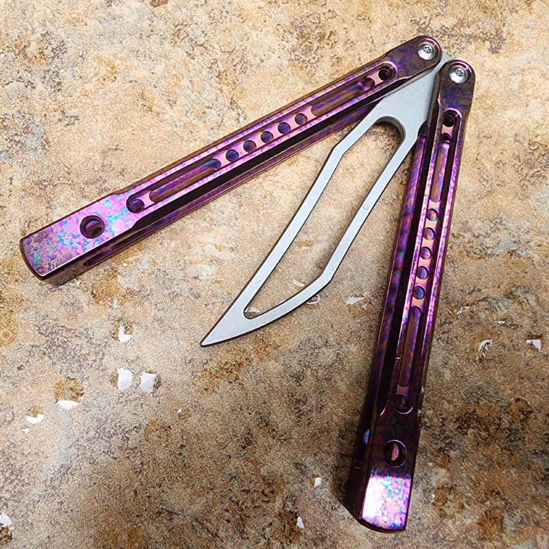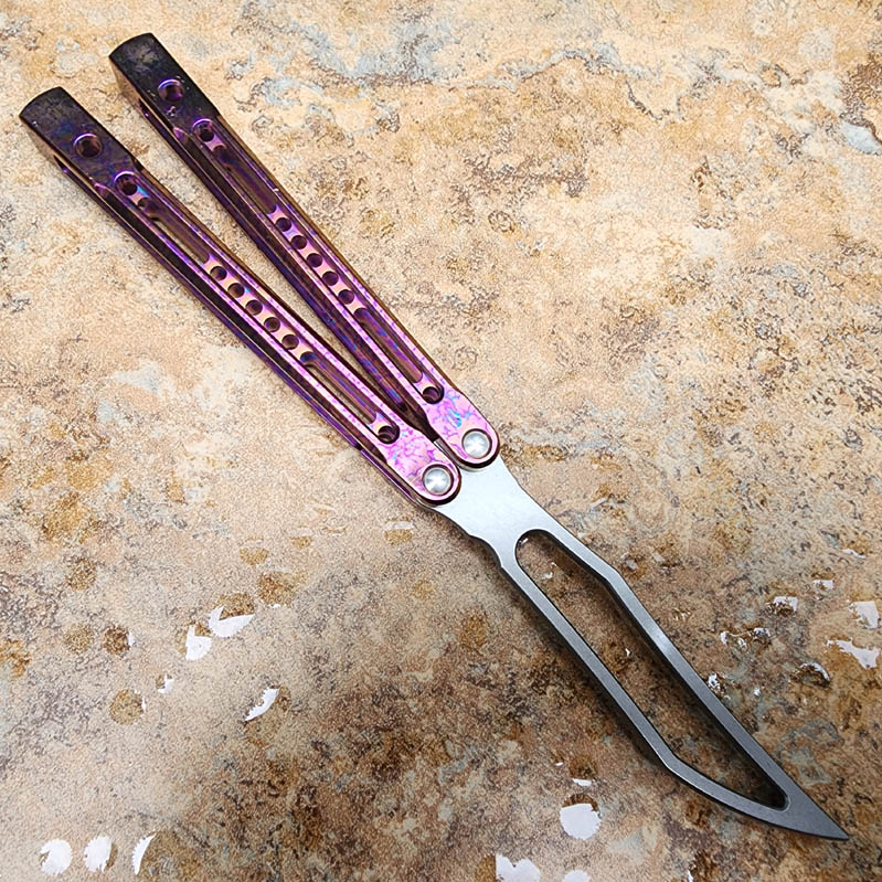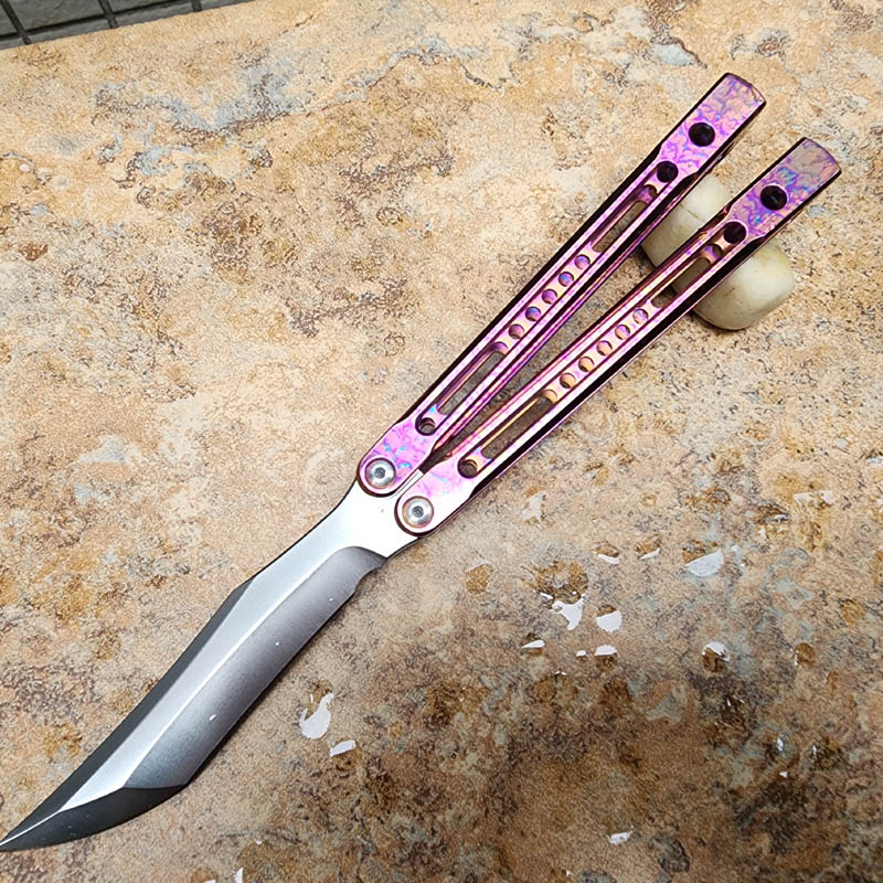 一体钛柄火烧纹JK King 君王蝴蝶甩刀系列,bushing轴套系统,搭配钛内衬,钛合金手柄,。转动非常顺畅,D2刃材,数控精磨