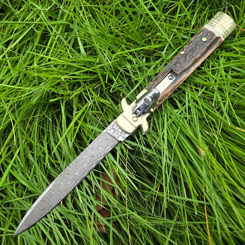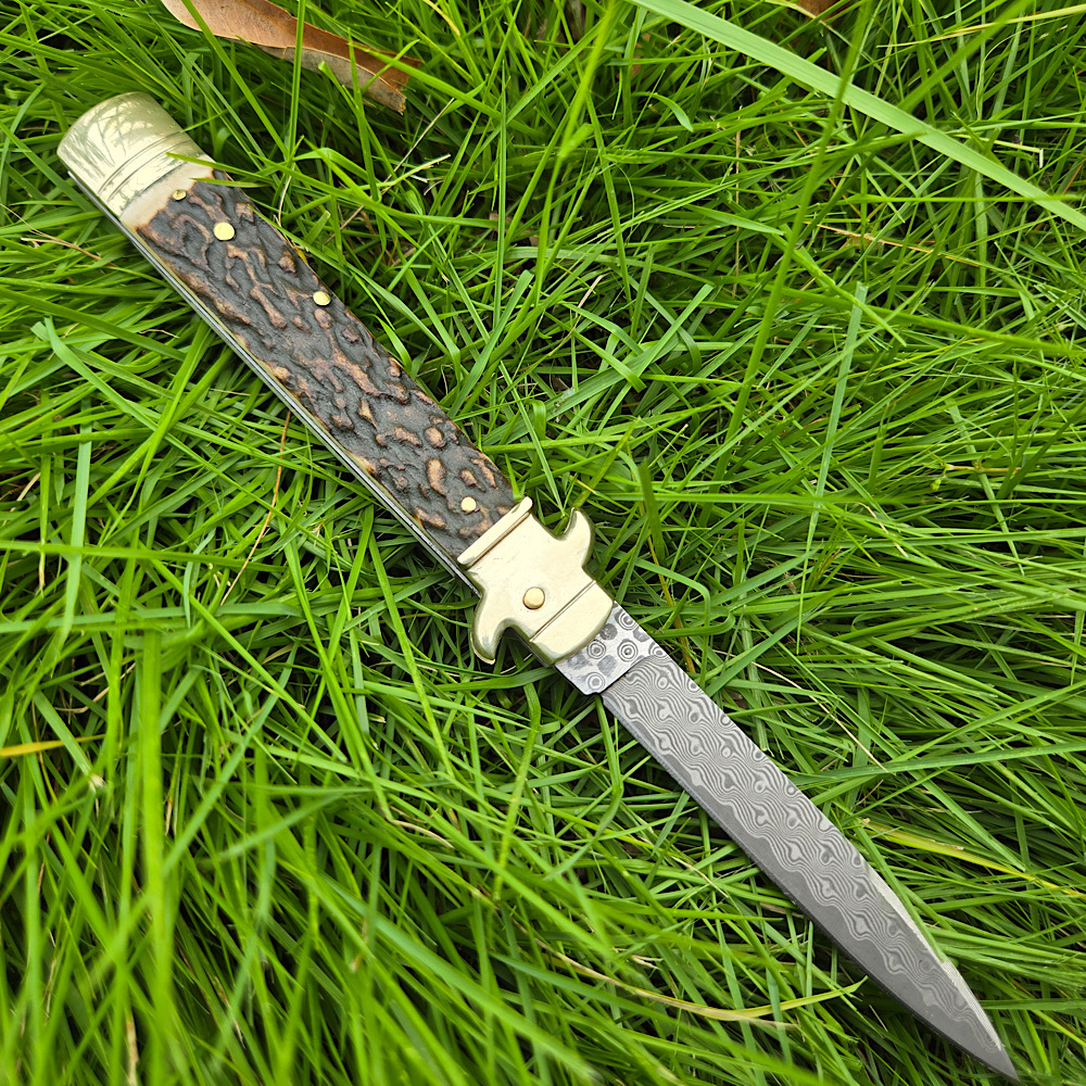 Plus款 正品意大利Akc 古典跳刀鹿角柄大马士革刃leverletto