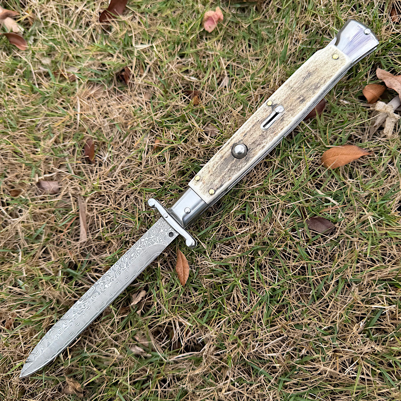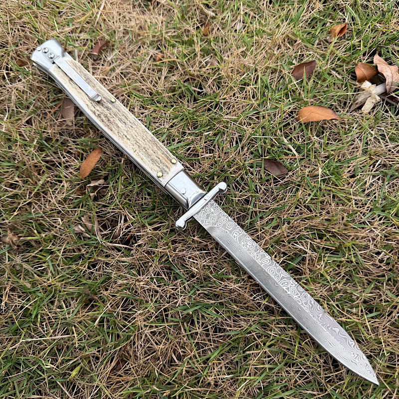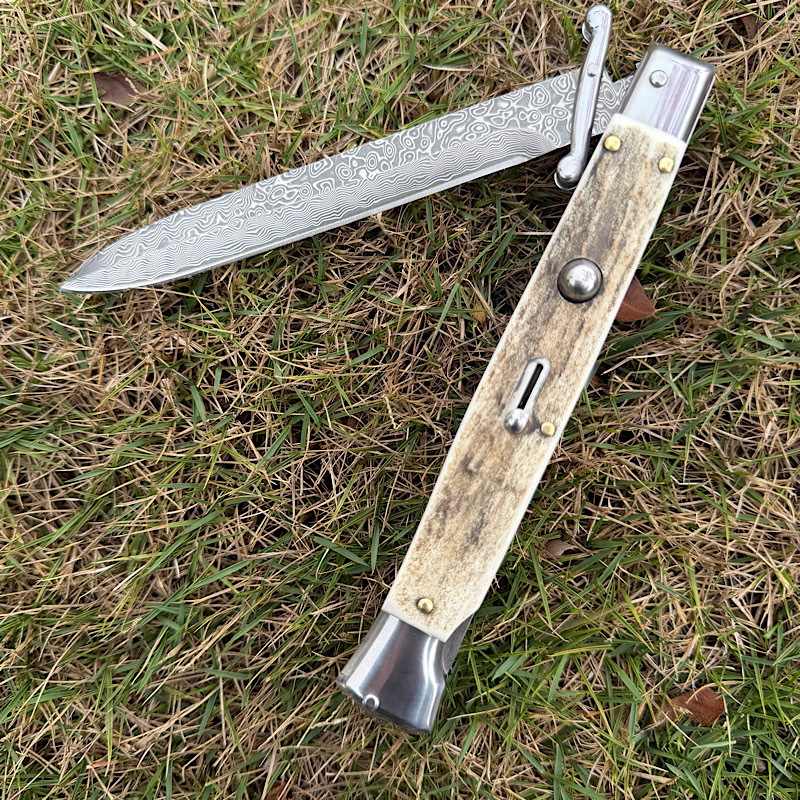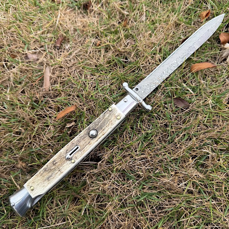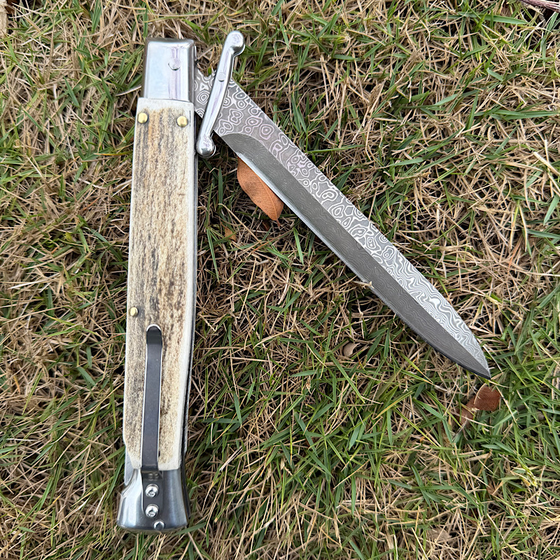 Italy Swinguard 意大利黑手党系列,收藏级别的经典的守护神跳刀,其特色是可摇摆折叠的护手,弹出刀时候护手随即打开形成保护,全钢骨架铆天然鹿角,搭配雨点纹大马士革刀刃, 全手工抛磨,制造精良,纯手工工艺。AKC2026新款数控精磨刃,线条明晰,刃口锋利,经典意大利风格,非常适合收藏!!!